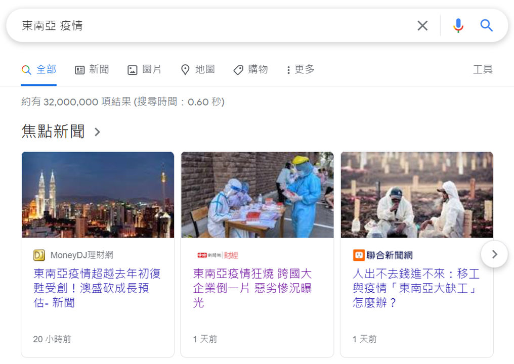 最原先想以中文的新聞來源抓個大概,於是在8/10上網查詢 “東南亞 疫情“ 這五個字,發現以下結果: